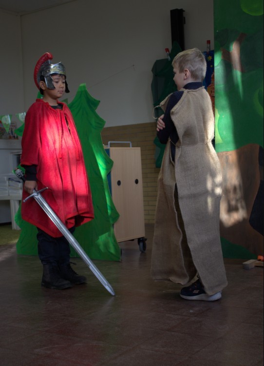 Bereits am Unterrichtsvormittag sorgte die Klasse 3a für einen besonderen Auftakt: Sie zeigte allen Klassen das einstudierte Martinsstück in Form einer Theateraufführung und brachte die Geschichte von St. Martin eindrucksvoll auf die Bühne.